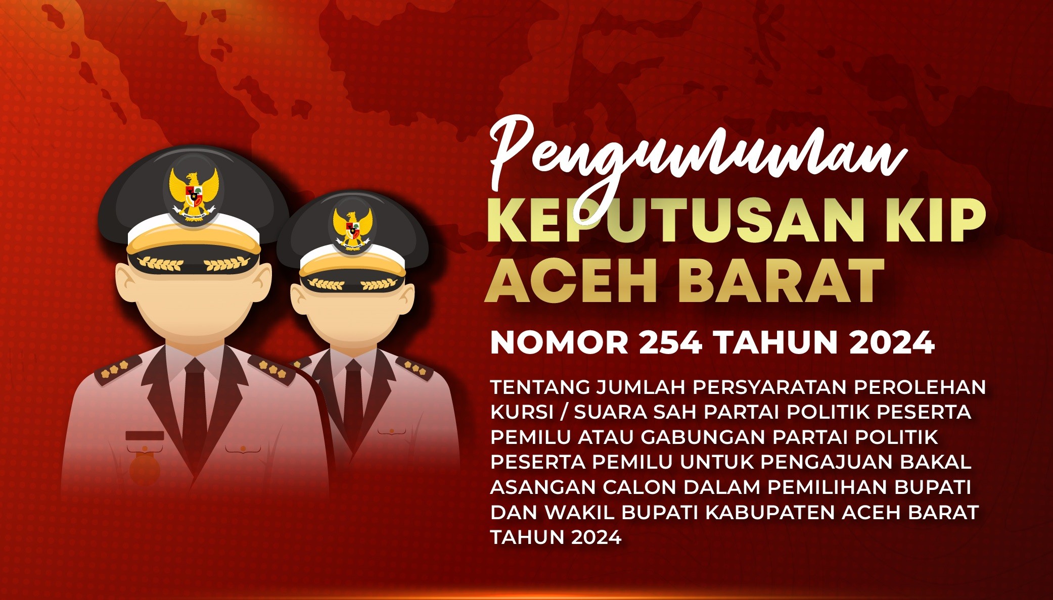 Berikut kami sampaikan Keputusan Komisi Independen Pemilihan Kabupaten Aceh Barat Nomor 254 Tahun 2024 Tentang Jumlah Persyaratan Perolehan Kursi Atau Suara Sah Partai Politik Peserta Pemilu Atau Gabungan Partai Politik Peserta Pemilu Untuk Pengajuan Bakal Pasangan Calon Dalam Pemilihan Bupati Dan Wakil Bupati Kabupaten Aceh Barat Tahun 2024