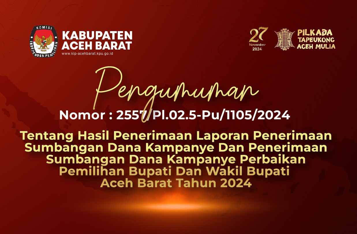 Berikut kami sampaikan Pengumuman Nomor : 2557/Pl.02.5-Pu/1105/2024 Tentang Hasil Penerimaan Laporan Penerimaan Sumbangan Dana Kampanye Dan Penerimaan Sumbangan Dana Kampanye Perbaikan Pemilihan Bupati Dan Wakil Bupati Kabupaten Aceh Barat Tahun 2024Pengumuman Nomor : 2557/Pl.02.5-Pu/1105/2024 Tentang Hasil Penerimaan Laporan Penerimaan Sumbangan Dana Kampanye Dan Penerimaan Sumbangan Dana Kampanye Perbaikan Pemilihan Bupati Dan Wakil Bupati Kabupaten Aceh Barat Tahun 2024
