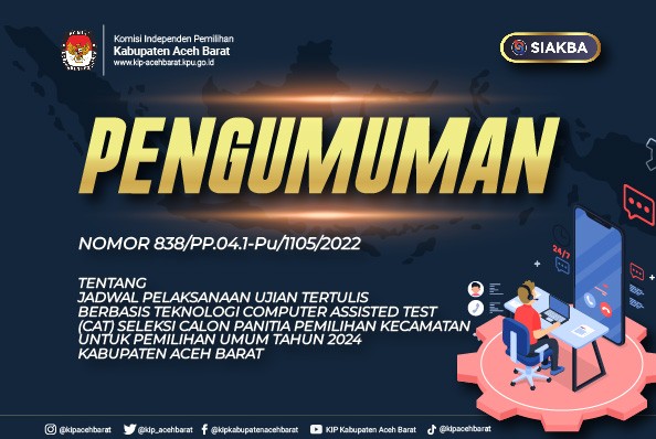 PENGUMUMAN JADWAL PELAKSANAAN UJIAN TERTULIS BERBASIS TEKNOLOGI COMPUTER ASSISTED TEST (CAT) SELEKSI CALON PANITIA PEMILIHAN KECAMATAN (PPK) UNTUK PEMILIHAN UMUM TAHUN 2024