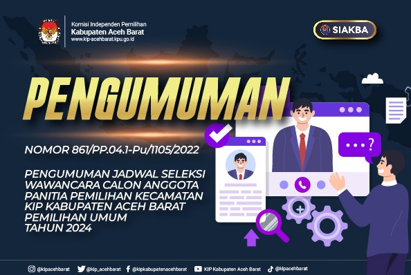 PENGUMUMAN JADWAL SELEKSI WAWANCARA CALON ANGGOTA PANITIA PEMILIHAN KECAMATAN (PPK) KIP KABUPATEN ACEH BARAT PEMILIHAN UMUM TAHUN 2024
