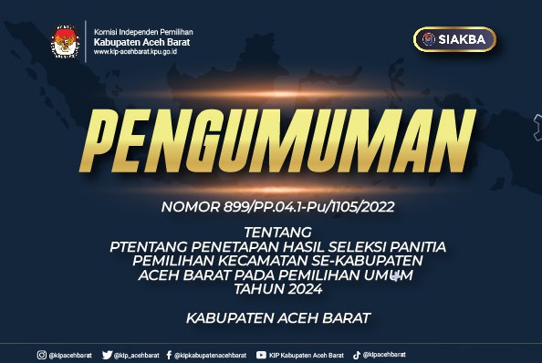 PENGUMUMAN TENTANG PENETAPAN HASIL SELEKSI PANITIAN PEMILIHAN KECAMATAN SE-KABUPATEN ACEH BARAT PADA PEMILIHAN UMUM TAHUN 2024