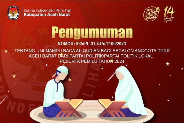 PENGUMUMAN UJI MAMPU BACA AL-QUR’AN BAGI BAKAL CALON ANGGOTA DPRK ACEH BARAT DARI PARTAI POLITIK/PARTAI POLITIK LOKAL PESERTA PEMILU TAHUN 2024
